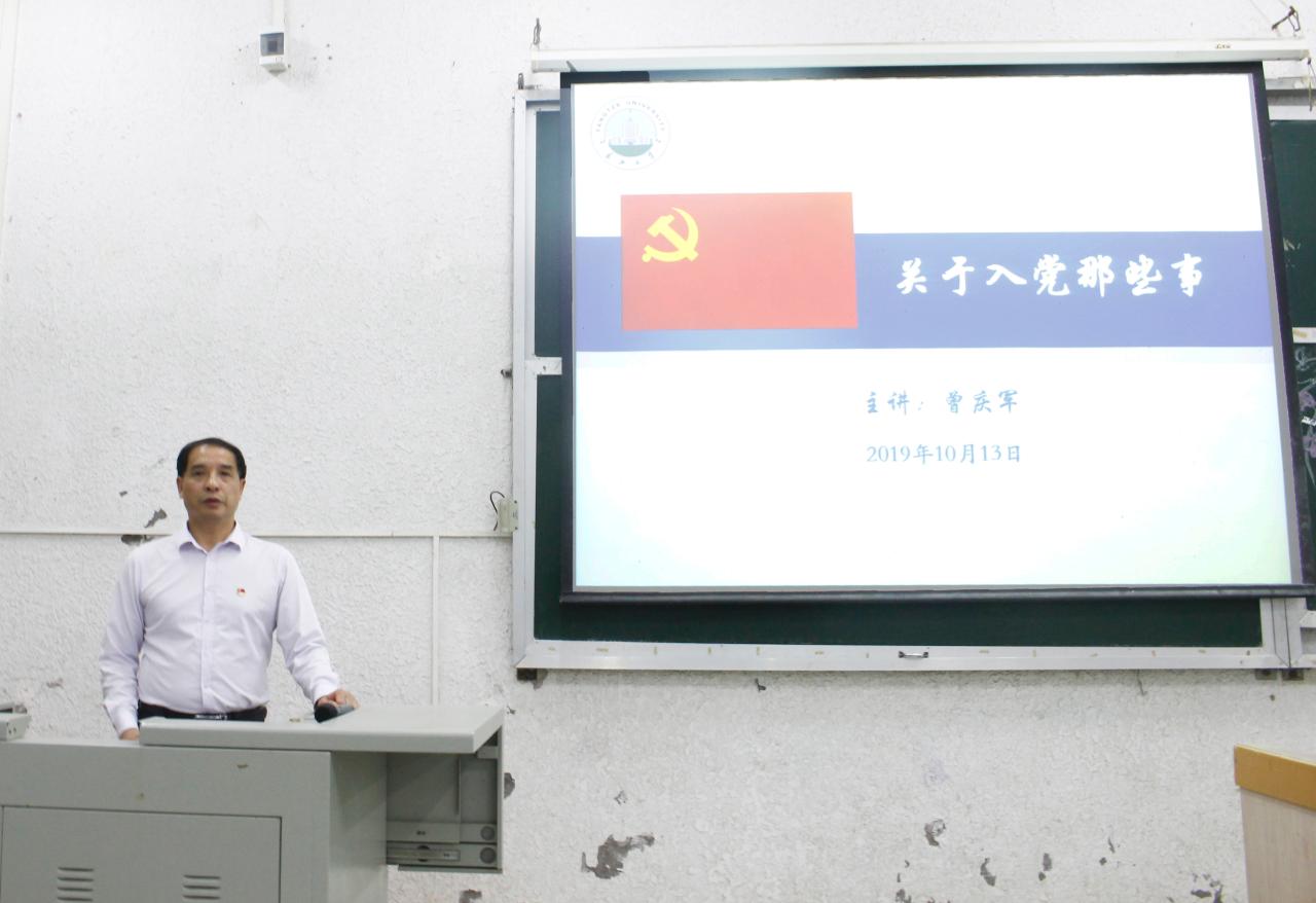 讲座正式开始,曾庆军从入党的好处、什么样的人能发展入党和发展党员的基本程序这三个问题开展了本次讲座。他首先介绍了党组织的性质,其中包括党组织的常识、规模、行动指南等等,让大家对党组织有了初步的了解。他指出正确的入党动机是为了献身共产主义事业,更好的为人民服务。接着他详细地介绍了发展党员的5个阶段25个程序,提出“组织上入党一生一次,思想上入党一生一世”,倡导大家在日常生活中要严格要求自己,在思想上要不断进步。