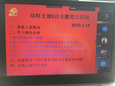 为深入学习贯彻习近平总书记关于疫情防控工作的重要讲话和指示精神,引导广大党员用马克思主义立场、观点、方法认识和对待宗教,坚定共产主义信仰和中国特色社会主义信念,动科系党支部在2020年5月14日下午以腾讯会议的形式召开了主题党日活动。动科系党支部全体党员参加会议,会议由支部书记杜晋平主持。