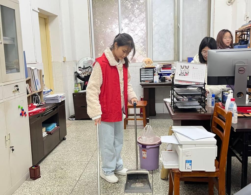 在整个实践劳动过程中,各小组带着清洁工具前往各自区域,擦拭会议室内的桌面,清扫地面以及室内的各个角落。每位同学都热情满满,积极响应学院号召,挥洒汗水,为整洁明亮的环境进行辛勤劳动。活动结束后,同学们将垃圾装运丢至垃圾桶,并将清扫工具放至原处。对焕然一新的会议室,每个人的脸上也都露出了笑容。