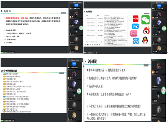 首先,动医专业毕业生何思雨给大家分享了自己考入武汉病毒研究所的一些复习经验。主要是从考研后的收获、选择方向、如何复习、研究所与院校的区别及心态5个方面展开:来自动科专业毕业生向大家详细介绍了自己考入西北农林科技大学的复习计划及方法。主要从如何做?怎么做?16个考研的终极问题以6条建议等几个方面展开。在此期间同学们踊跃提问问题,两位毕业生详细的进行解惑。他们的分享让新葡萄官网2019级学生对考研形势、考研方向和备考环节有了进一步的认识和理解,也激发了同学们的考研热情。