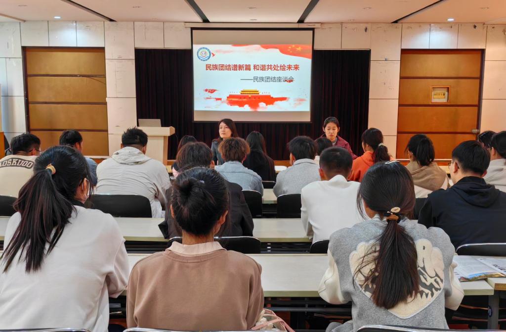 座谈会开始前,全体人员共同观看了全国民族团结进步表彰大会的新闻视频。党委书记对习近平总书记重要讲话精神进行了传达阐释,她指出,全体师生要以铸牢中华民族共同体意识为主线,通过生活中一个个榜样人物激励自己,讲好鲜活的民族团结故事,以己之力不断巩固和发展民族团结,为以中国式现代化全面推进中华民族伟大复兴伟业而不懈奋斗。会上,各少数民族学生分别从家乡发展变化、在校学习生活、个人未来展望等方面进行了交流发言,一致认为,民族团结是各族人民的生命线,在党和国家的关心支持下,自己所生长的民族地区发生了翻天覆地的变化,经济社会发展取得了前所未有的成就;作为新时代青年学子,将牢记党和国家的嘱托,坚决维护民族团结,用自己的青春力量为党和国家的民族事业添砖加瓦。最后,党委书记与辅导员就少数民族新生代表提到的有关学业、生活问题进行了详细解答,并鼓励各位同学在学习生活中要珍惜青春大好时光,学好专业知识,提升综合素养,将个人梦想与家国梦想融合在一起,努力成为德智体美劳全面发展的社会主义建设者和接班人。