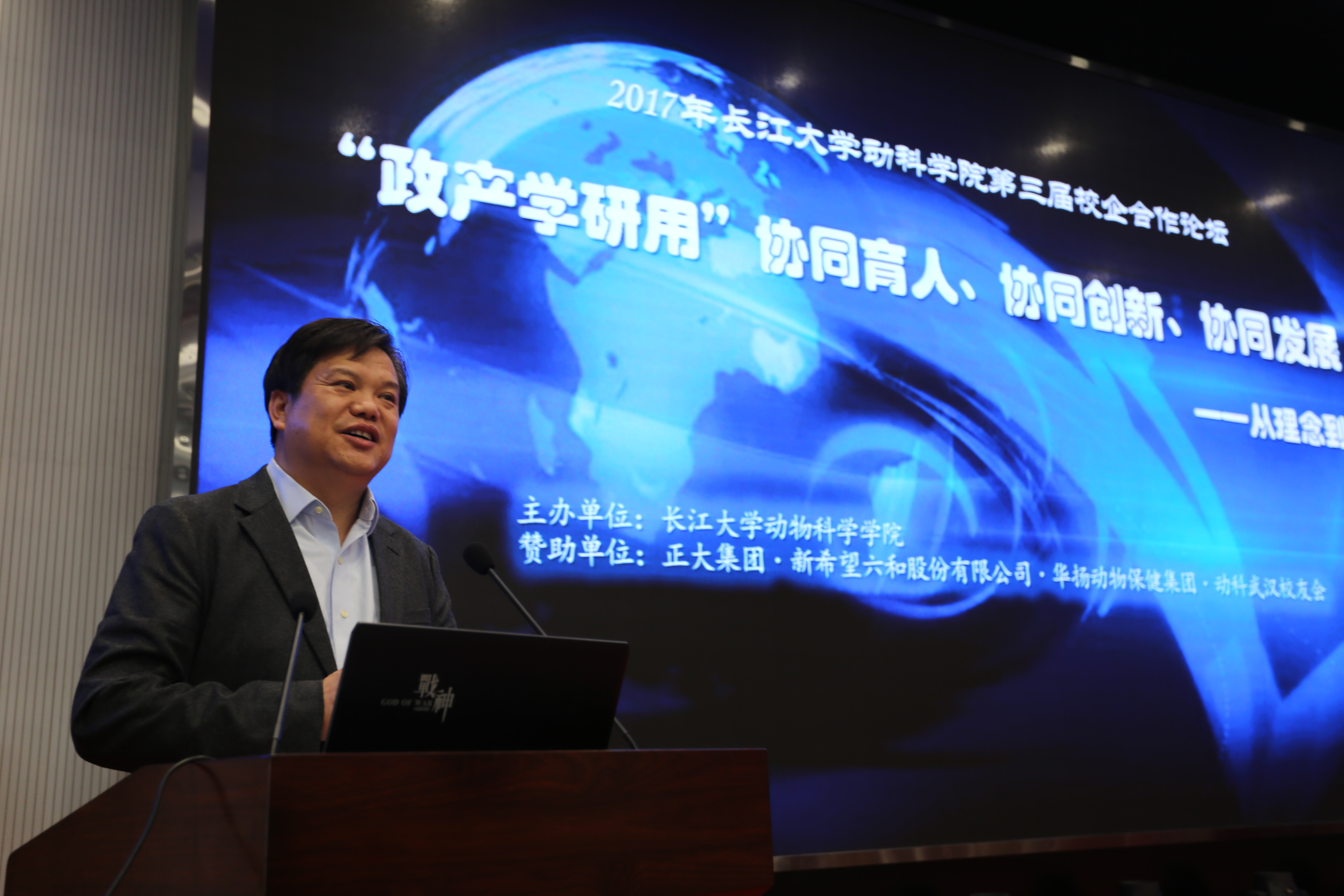 动物科学学院院长杨玉莹致欢迎辞。他说,创新创业教育是新时代对人才培养的要求。要把学生从“被动适应社会”的求职者培养成为“主动适应甚至挑战社会”的建设者,实现“政产学研用”五方共赢,核心就是人才和创新。行业、企业的人才精英成长过程,从大学入学已然开始,所以不论是学校还是企业的事业是大家共同的事业,推动企业升级和行业的协同发展也是校企之间的共同责任。