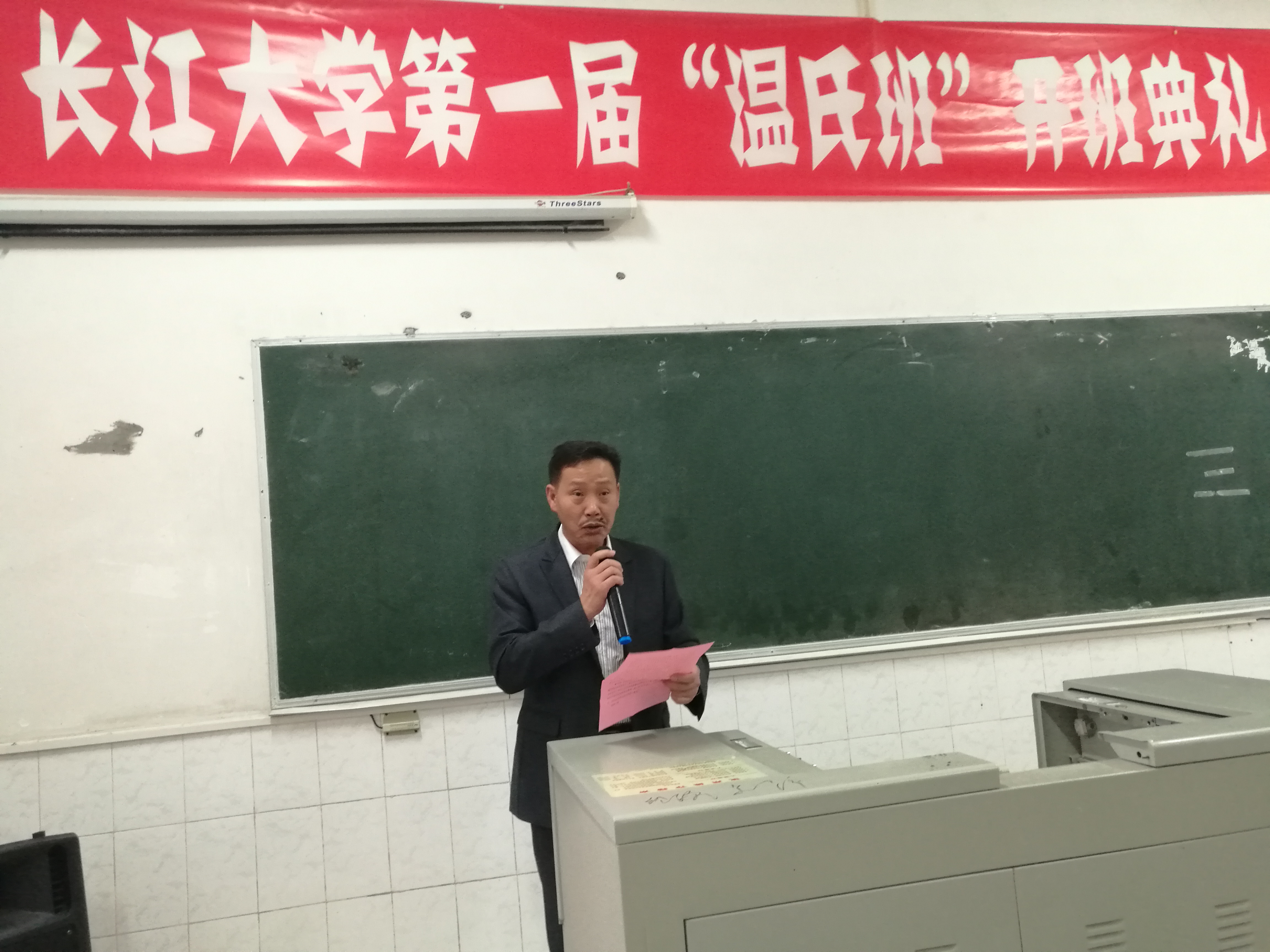 杨玉莹院长致辞,感谢温氏集团为成立温氏班所做的努力,希望温氏班全体学员充分利用校企合作平台加强专业学习,学习企业文化和温氏精细的管理。