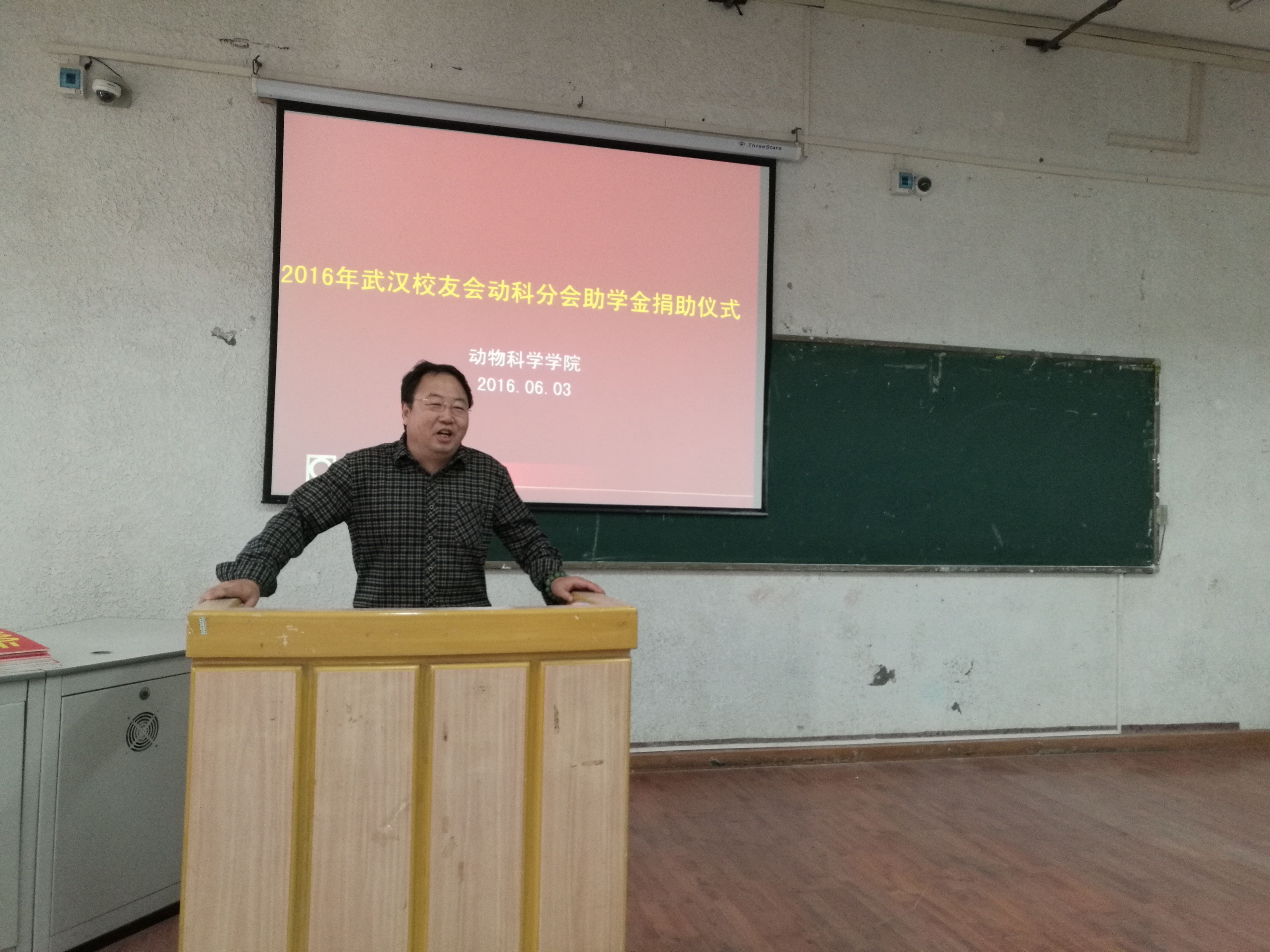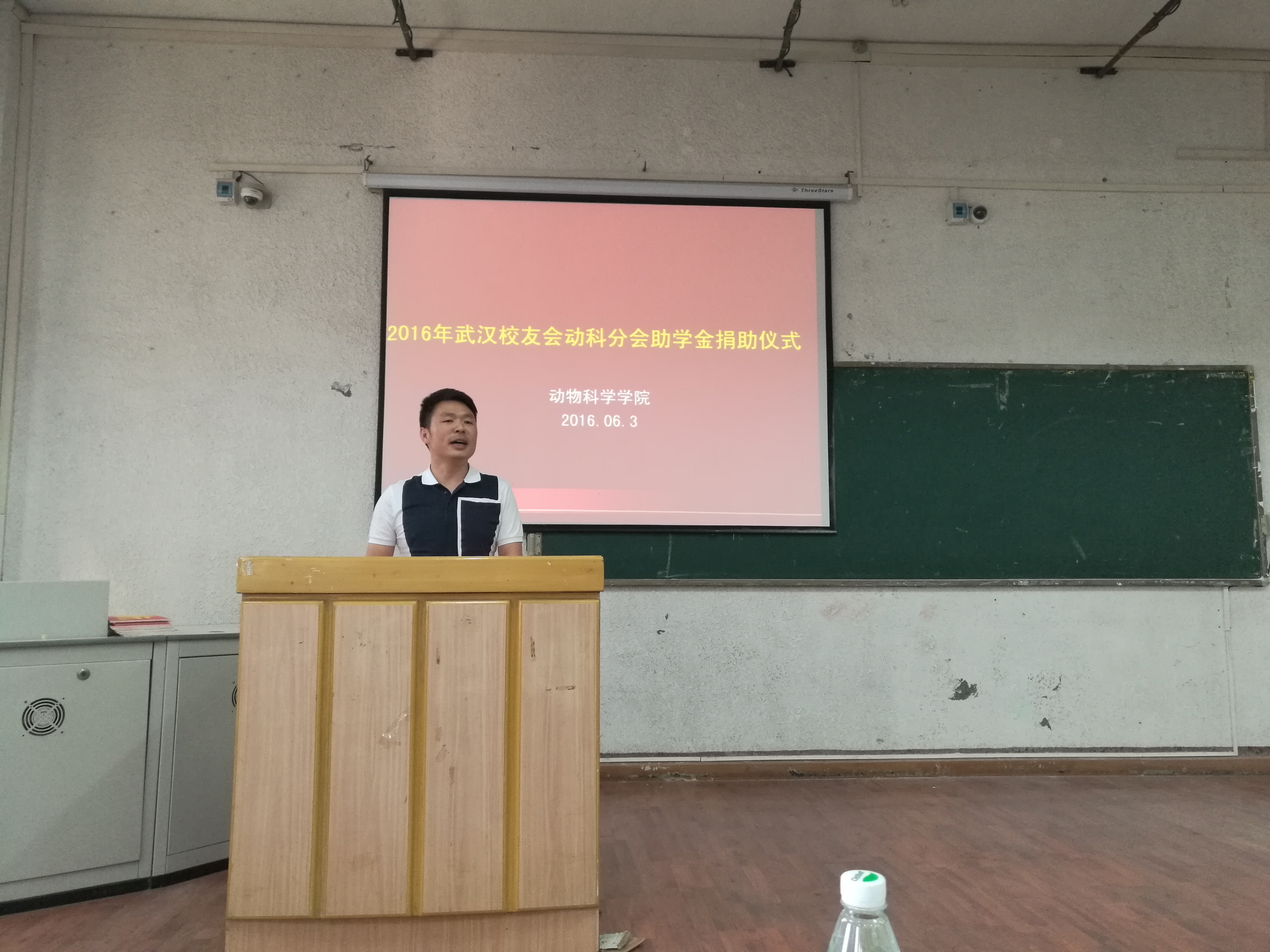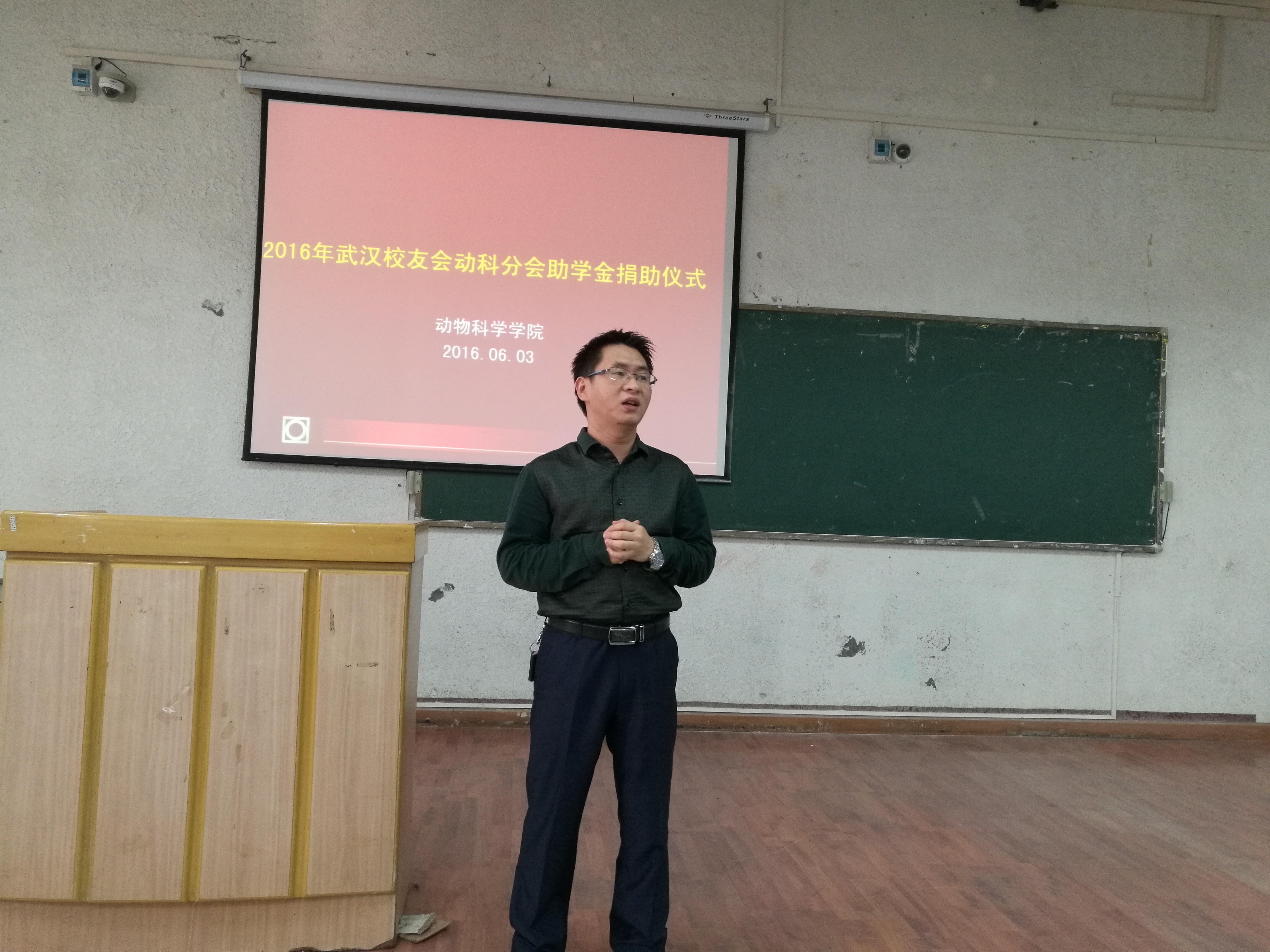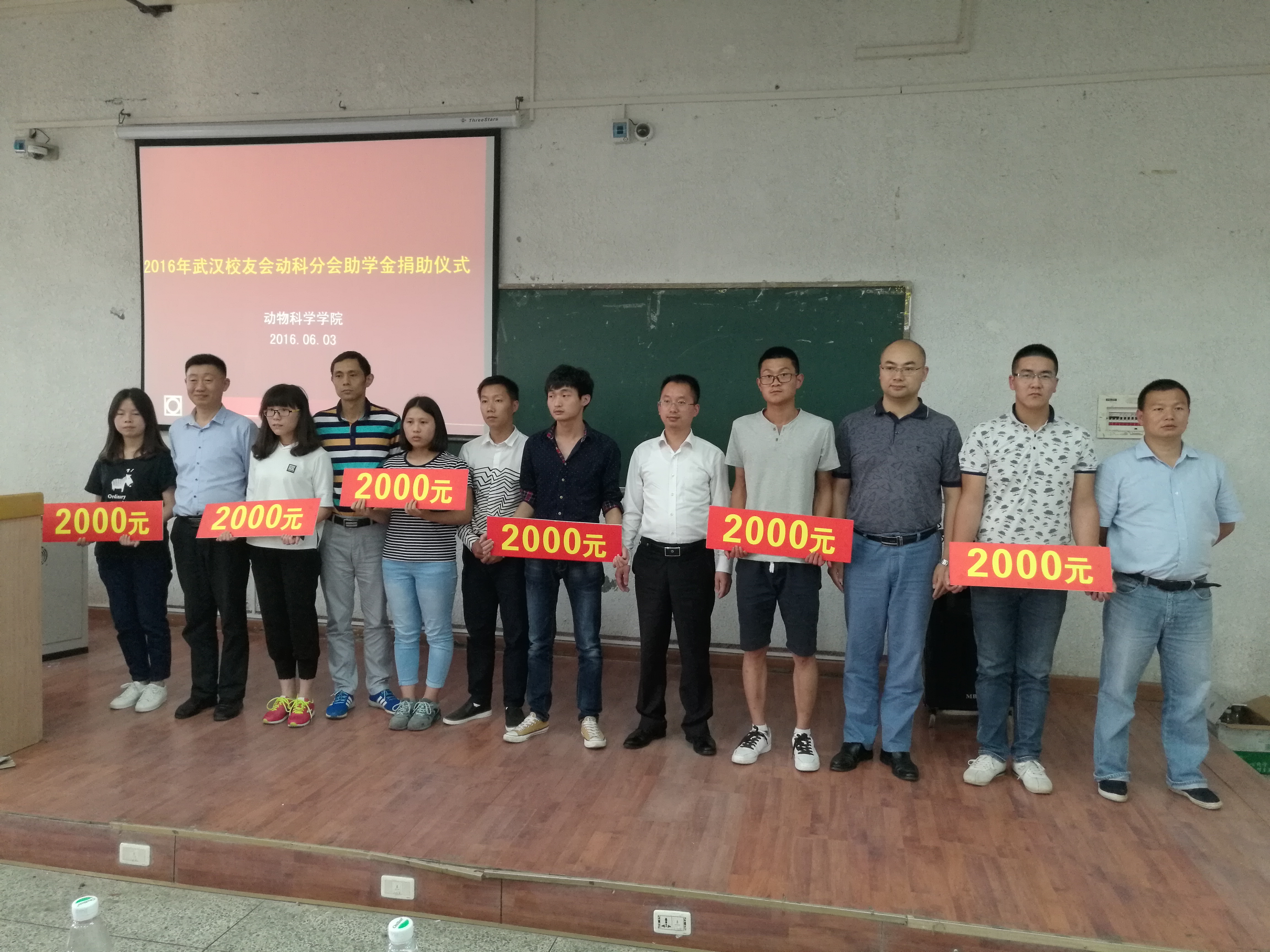 2016年6月3日,新葡萄官网amg武汉校友会动科分会励志助学金捐赠仪式在西校区5-203教室举行,胡新祥、杨杰、吴俊达、申宇、王静、向丹、覃利、卢胜月、邢邻玉、熊艳、夏思妮、李东冉、吴涵、刘晓蓉14名同学每人获得2000元的励志助学金。87级校友、武汉华龙饲料有限公司总经理侯著科,95级校友、武汉校友会动科分会会长、华扬动保集团总经理张波,96级校友、湖北大北农饲料有限公司预混料事业部总经理杨巍,97级校友、美国建明工业广东公司副总经理李瑞,01级校友、随州正大饲料有限公司副总经理付学智,05级校友、武汉校友会秘书长、正大食品湖南湖北区总经理秦浩曦等七位校友带着武汉校友会动科分会的爱心抵达学院给动科学子送来爱心和关怀。新葡萄官网amg校友总会副会长、校友基金会秘书长赵长勇,校友基金会外联部部长张旭,动科院院长杨玉莹、党委书记王凌华、副院长李鹏、副书记王雨出席了捐赠仪式。