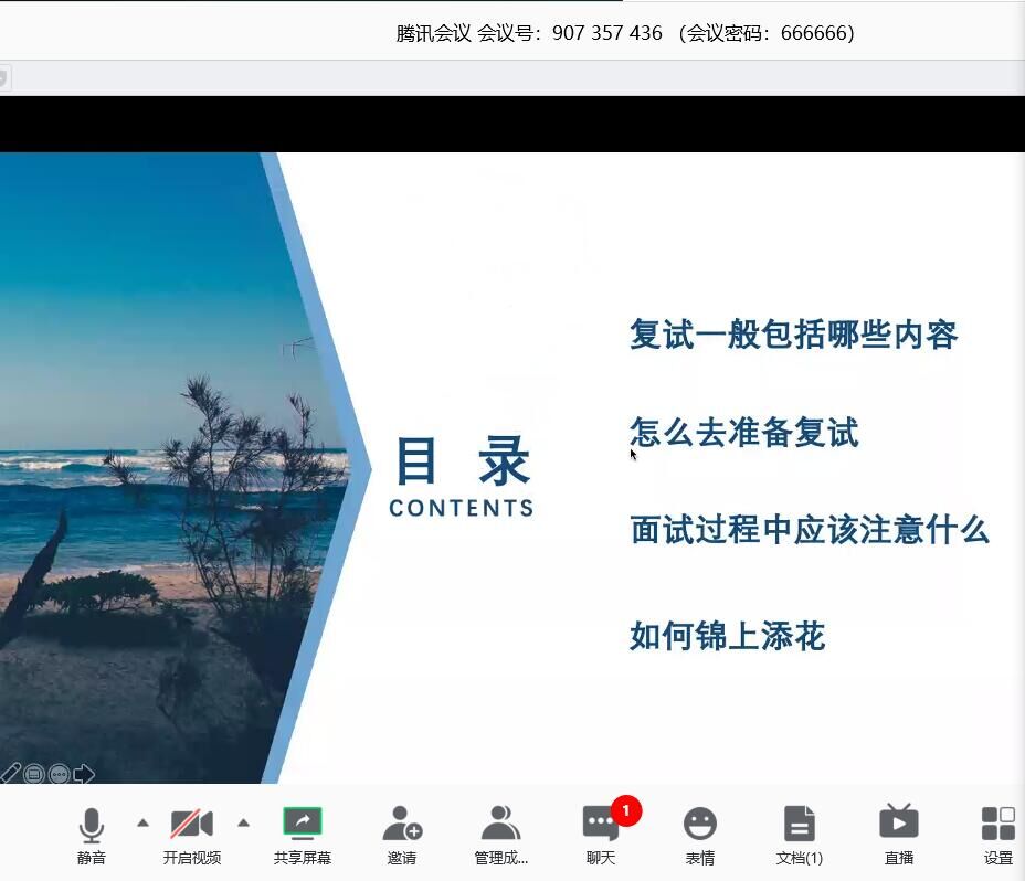会议最后苏晓云总结此次会议并强调大家切不可打无准备之仗,疫情尚未结束,要紧跟政策变化,适应网络学习的方式,做好复试准备工作,积极主动的和导师学长沟通。最后她希望大家以认真、积极的心态迎接复试,并预祝大家复试成功,考上理想院校。