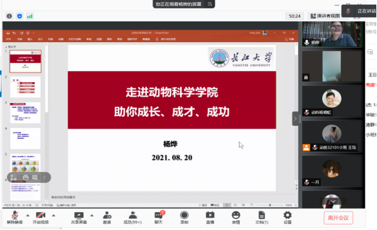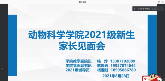 (通讯员 王 珏)“老师,我们专业学什么?有早晚自习吗?学校环境和宿舍环境怎么样?封校期间我们能做什么?”…….带着这些问题新葡萄官网在8月28日晚19:00---21:00利用腾讯会议召开线上“动科院2021级新生家长见面会”,本次会议旨在帮助新生和家长了解学院背景,专业方向,熟悉大学学习与生活环境,掌握开学须知,交流新生入学方面遇到的问题。学院院长杨烨、党委副书记苏晓云、2021级学生辅导员杨湘虹、2021级各班班主任、2021级全体家长及部分学生参加会议。会议由党委副书记苏晓云主持。