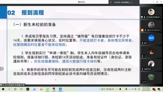 其次,21级辅导员杨湘虹详细讲解了新生开学报到须知,重点讲解了申请到校条件,包括连续14天健康打卡,通信大数据行程卡、健康码均为绿色,报告疫苗注射情况,所处位置不属于中高风险区等条件。会议还说明了新生报到流程和需求,要求家长不进校,学生有序扫码进入学校;学生自行配备餐具和口罩等。会后,每位学生认真填报了返校申请,并坚持做好每日健康打卡,为秋季开学顺利返校做好准备。
