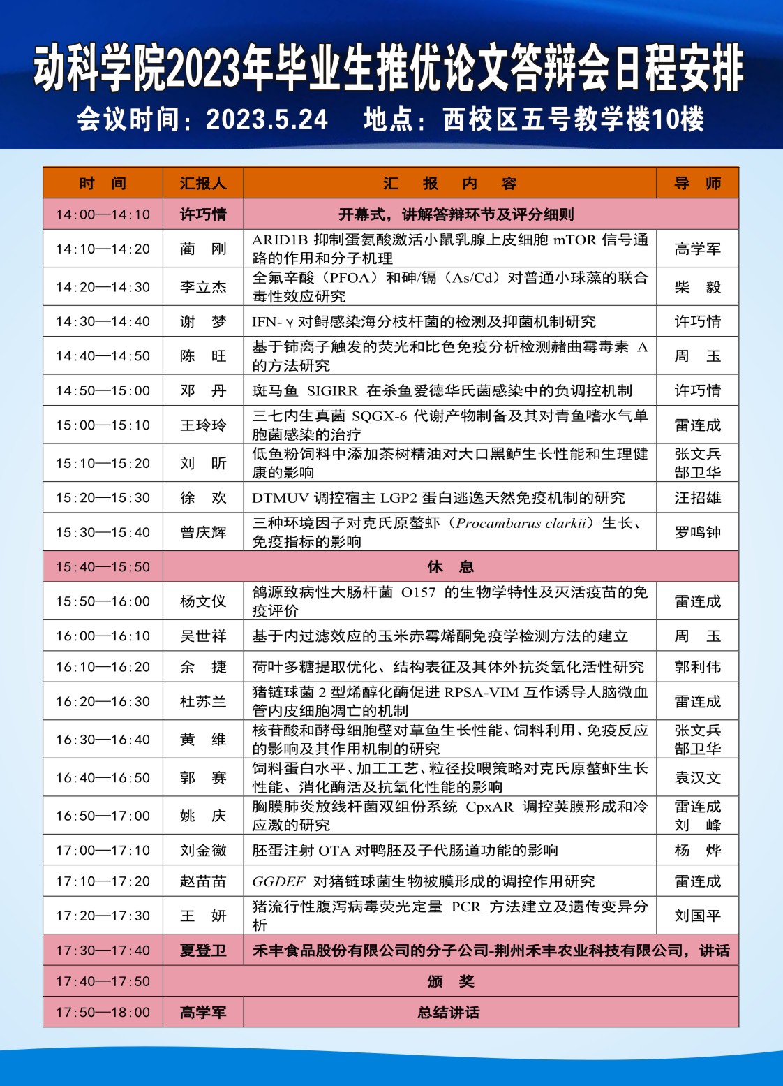 通讯员:(许巧情) 根据《新葡萄官网amg评选优秀博士、硕士学位论文管理办法》(研院发〔2018〕19号)及《关于做好2023年动科院研究生推优论文评审工作的通知》的规定,为提高新葡萄官网研究生培养质量,营造良好的学术氛围,激励广大研究生勤奋学习、潜心钻研、勇于创新,学院举办了2023届硕士论文推优会。经个人申报,导师推荐,学院组织评审,遴选了16位研究生参加推优答辩会。会议于2023年5月25日下午在学院10楼会议室举行,本次会议得到了禾丰食品股份有限公司的分子公司-荆州禾丰农业科技有限公司友情赞助,16位研究生均获得了300-800元的奖励。