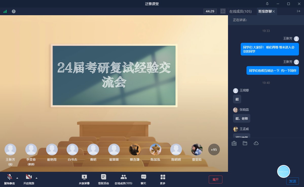 2024年2月5日,beat365英国官方网站采用泛雅课堂形式举行考研复试经验交流会。参加会议的有王新芳副院长、李荣春老师、受邀进行经验分享的beat365官网2019级三位同学和beat365官网2020级本科及2022级专升本班完成考研初试的同学。会议由王新芳教授主持。