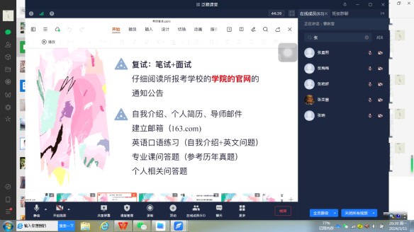 2024年3月11日,beat365英国官方网站在学校开学后,考研同学全面进入准备复试阶段,采用泛雅课堂形式再次举行考研复试/调剂经验交流暨指导会议。参加会议的有王新芳副院长、李荣春老师、受邀进行经验分享的beat365官网2019级三位同学和beat365官网2020级本科及2022级专升本班完成考研初试拟上国家线的同学。