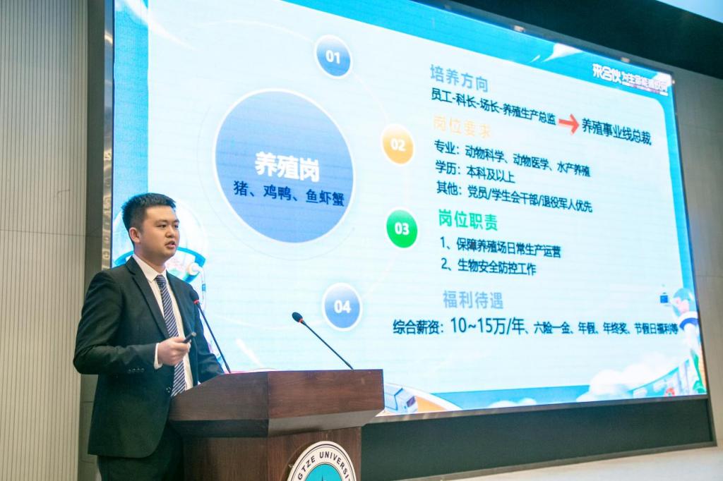在岗位发布环节中,正大集团农牧食品企业湖北区养殖事业人力资源总监陈俊卓详细介绍了2024-2025年度正大集团招聘岗位需求及招聘数量,并从人才培养理念、各岗位工作特点出发,介绍了公司的培养模式和人才发展路径,为新葡萄官网学子提供了非常多的优质岗位,希望同学们积极报名投递简历,长大了上长大,毕业了到正大。