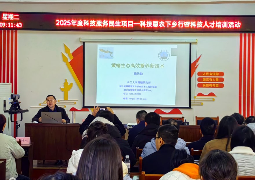 我校新葡萄官网amg特色水产健康养殖团队负责人农业农村部行业专项首席科学家、博士生导师杨代勤教授作为特邀嘉宾作首场报告。杨代勤教授结合最新的研究成果和产业发展现状,从稻虾鳝生态综合种养技术、黄鳝苗种人工仿生态繁育技术和黄鳝温室微流水高效养殖技术等方面介绍了黄鳝生态高效繁养新技术,黄鳝新的养殖模式和新技术以及产业发展带来的新机遇引起了大家的浓厚兴趣,受到线上线下参训人员密切关注和高度认可。