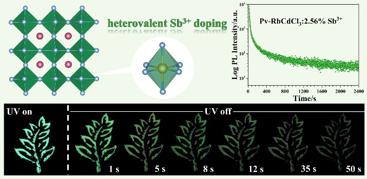 同时,研究证实,在Pv-RbCdCl3中掺杂锑离子,得到有反常热猝灭(148 K-328 K)和超长余辉(>2400 s)光学特性的Pv-RbCdCl3:Sb3+单晶。实验结果和理论分析表明,Sb3+能优化Pv-RbCdCl3晶体的带隙和浅阱态分布,宽带绿光发射源于Sb3+的5s2电子在带隙间的跃迁,余辉和反常热猝灭是由于被俘获的激子逐渐跃出阱电子中心,从而释放能量补偿非辐射损耗。基于RbCdCl3的热可逆结构相变,该长余辉材料在防伪、信息加密和生物成像等方面具有应用前景。