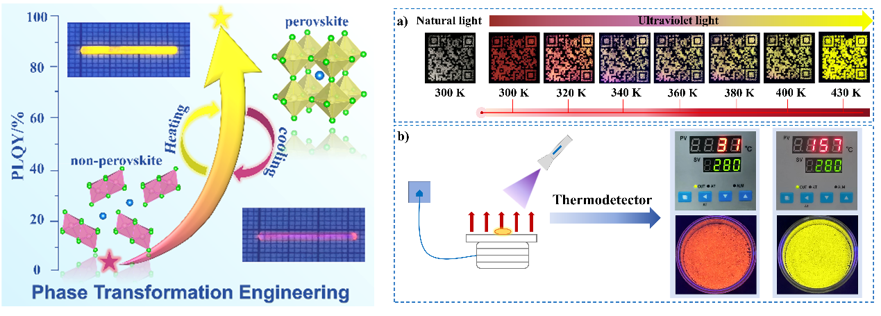 金属卤化物具有显著的光学特性,是一类光电应用的理想材料,但要实现材料的尖端性能,仍有大量挑战有待解决。本研究通过单晶X射线衍射技术探讨了全无机金属卤化物RbCdCl3从正交非钙钛矿相(non-Pv-RbCdCl3)到四方钙钛矿相(Pv-RbCdCl3)可逆的“晶体-晶体”的结构相变。基于这一可逆相变策略,成功制备了可逆热致变色荧光材料RbCdCl3:Mn2+。研究结果表明,采用简单的热活化策略,能促使荧光量子产率仅为3.1%的non-Pv-RbCdCl3:Mn2+红色荧光材料,转化为100%荧光量子产率的Pv-RbCdCl3:Mn2+黄色荧光材料。更重要的是,RbCdCl3:Mn2+具有反常的热猝灭效应,130℃的荧光强度达到室温荧光强度的1.6倍。RbCdCl3:Mn2+材料制备方法简单,可通过观察荧光颜色变化,简便得知温度,作为一项绿色技术应用于视觉温度计;同时,RbCdCl3:Mn2+材料具有可逆热致变色性能,在自然光下无色,在紫外灯下可由环境温度进行热致变色,可以应用于高级防伪领域。原位光学表征和第一性原理计算表明,两种晶体的光学特性主要取决于带隙之间的电子跃迁。Mn和Cl的轨道强烈影响两种晶体的光学性质,从而提升了晶体的荧光性能。