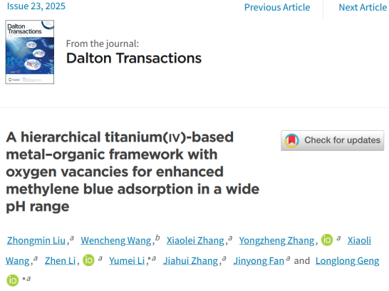 近日,beat365英国官方网站刘中敏博士在有机金属化学领域国际知名期刊Dalton Transactions(影响因子3.3,中科院二区)发表题为“A hierarchical titanium(iv)-based metal-organic framework with oxygen vacancies for enhanced methylene blue adsorption in a wide pH range”的研究论文。论文第一单位为德州学院,刘中敏博士为文章第一作者,耿龙龙教授和李玉美教授为通讯作者。该研究得到了福州大学王文成教授的指导。