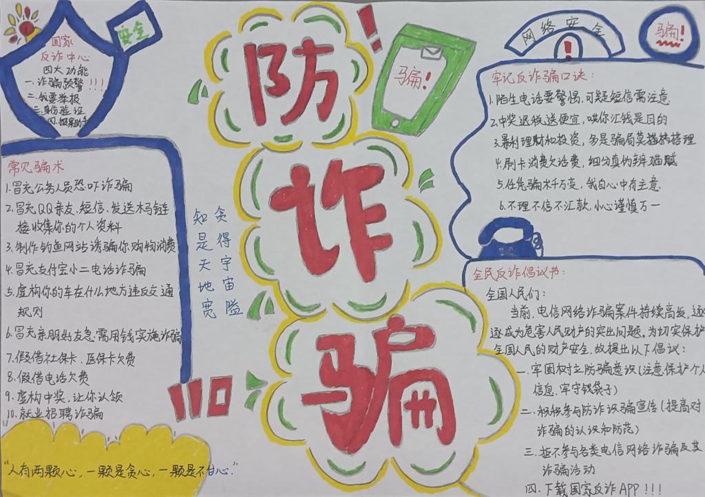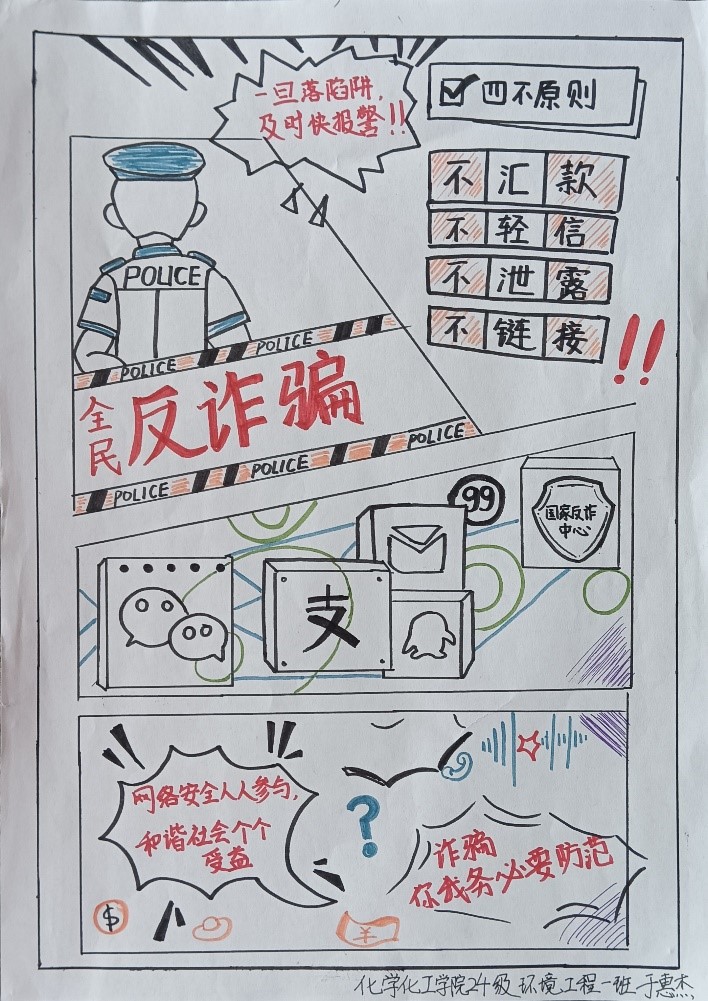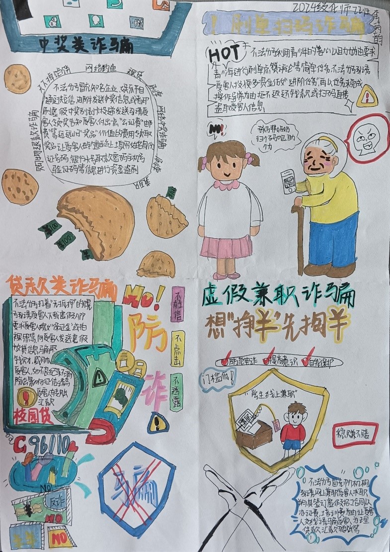 本次活动以海报作品征集的形式展开,同学们充分发挥自己的创意和才华,用生动的画面和文字传达反诈防骗的重要性。新生们热情高涨,积极参与。一幅幅色彩斑斓、寓意深刻的海报作品,凝聚着同学们对反诈防骗的理解和认识。