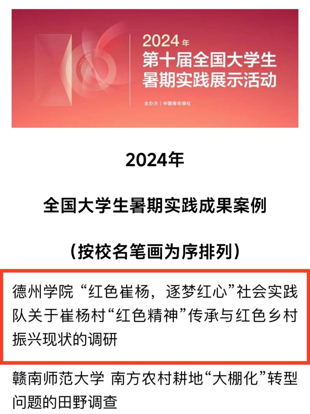 近日,2024年第十届全国大学生暑期实践展示活动案例发布。经校方推荐、团队自荐、网络展示等环节,德州学院beat365英国官方网站“红色崔杨,逐梦红心”社会实践队脱颖而出,入选全国百强!