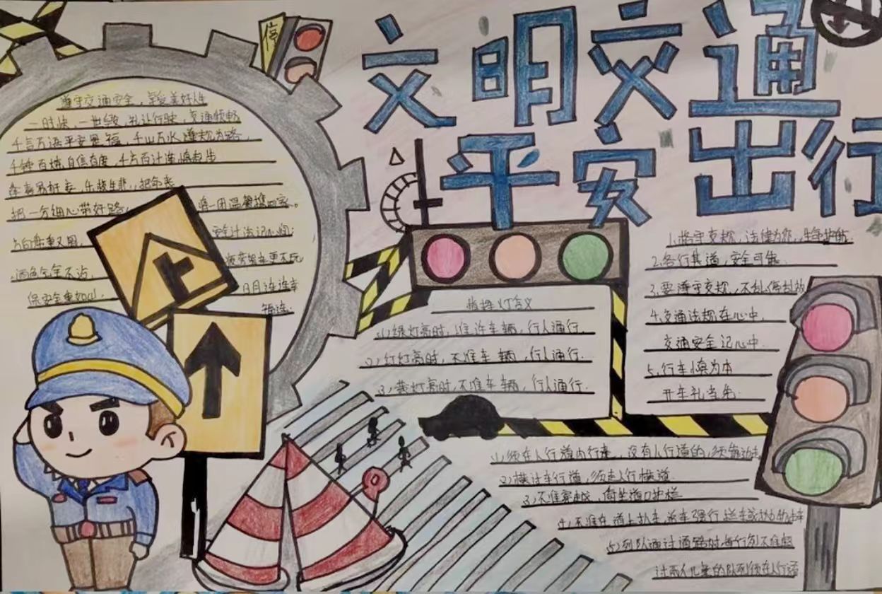 活动过程中,同学们围绕“行人安全须知”“骑行规范”“乘车礼仪”三大核心内容进行创作。他们将交通标志、安全口诀与生动活泼的插画巧妙融合,创作出主题鲜明、内容丰富的作品。这些作品既传达了交通安全知识,又通过形象直观地表达增强了教育的趣味性和感染力。
