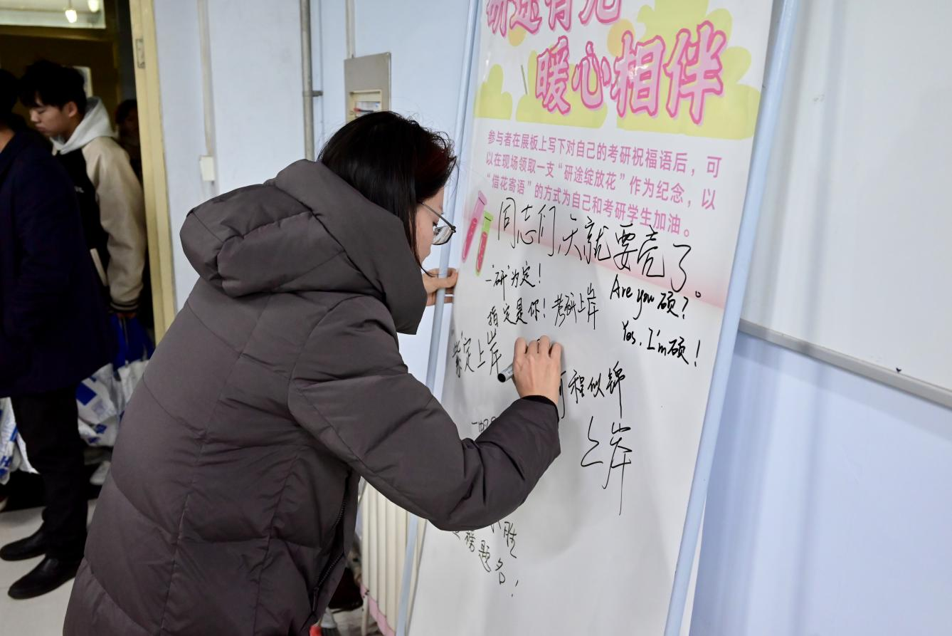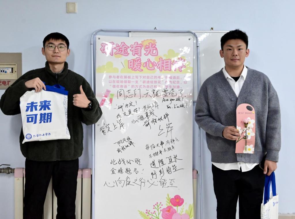 活动现场暖意融融,老师们化身“暖心使者”,为每一位到场学子递上精心挑选的“研途绽放花”与考研小礼品。“研途绽放花”象征着希望与美好,专属定制实用小礼品则寄托着学院的殷切期许。学院党委书记在画板上写下考研祝福语,为考研学子加油打气,趣味互动让考研学子紧绷的神经得到充分放松。此外,现场还设置了暖心交流区,心理部成员与学子们亲切交谈,倾听备考困惑,分享减压小技巧,用真诚陪伴为学子们提振信心。