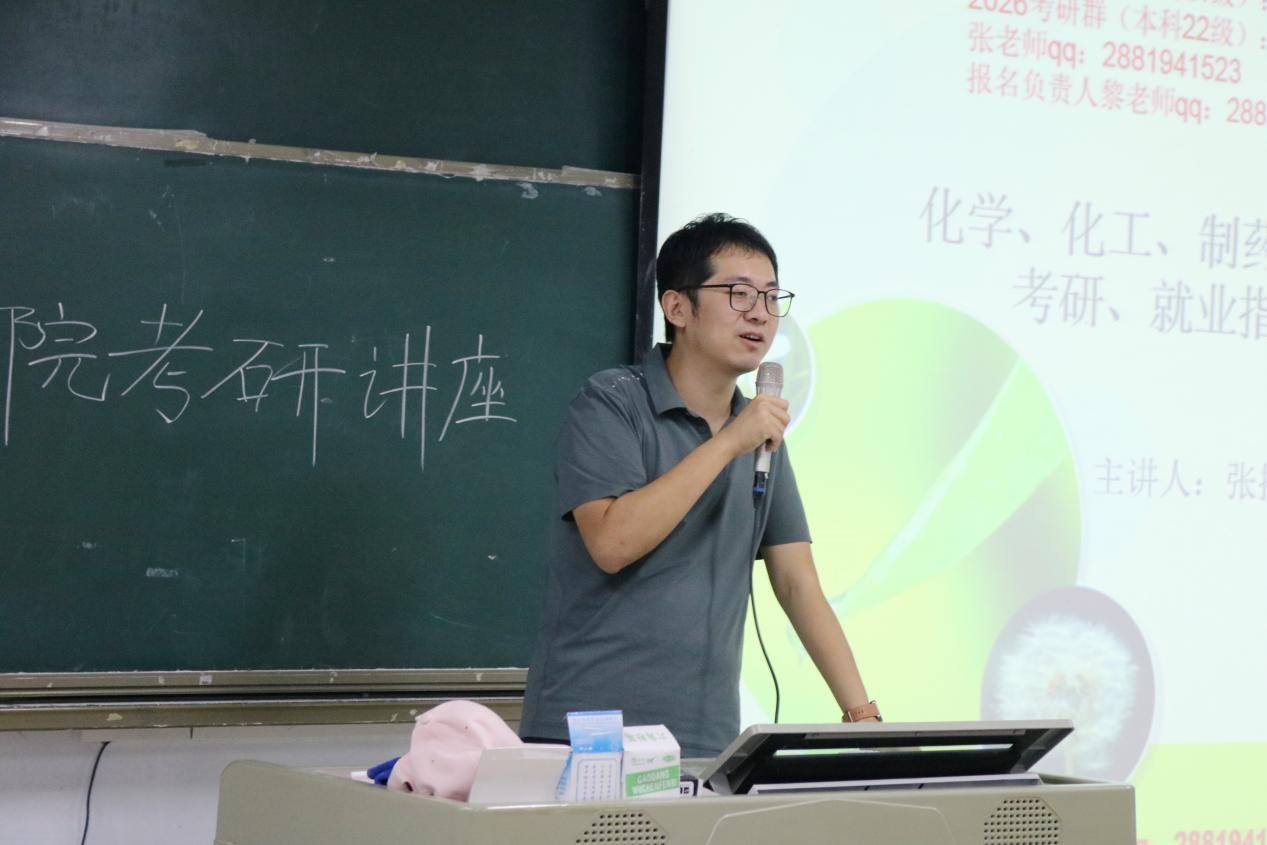 张老师就考研目的、考研优势、专业方向的选择和考试科目等与考研密切相关的信息作了细致讲解,并结合自身多年来从事教学工作、指导学生的经验,向同学们就考研注意事项、报考专业、导师的选择等进行了指导。他表示,同学们要正视考研,合理定位,选择报考适合自己的院校,增强考研信心。同时,为同学们详细介绍了考研的报考流程以及注意事项,并分析了近年来化学化工报考发展新趋势,并重点解读了化学、化工、材料等考研热门专业及院校选择。