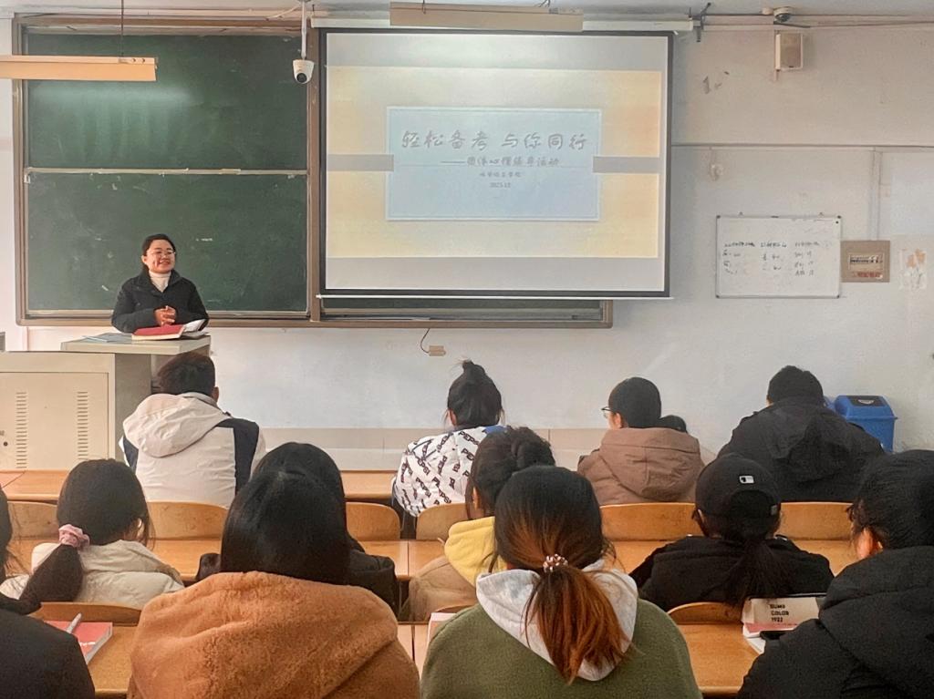 为帮助学生放松心灵,缓解压力,培养学生乐观向上的心理品质。12月6日,beat365英国官方网站在求实楼413教室举办了以“轻松备考,与你同行”心理减压主题团辅活动。本次活动由beat365英国官方网站心理辅导员、国家二级心理咨询师王培培老师主持,各班心理委员、宿舍心理守护员等共计50余人参加活动。