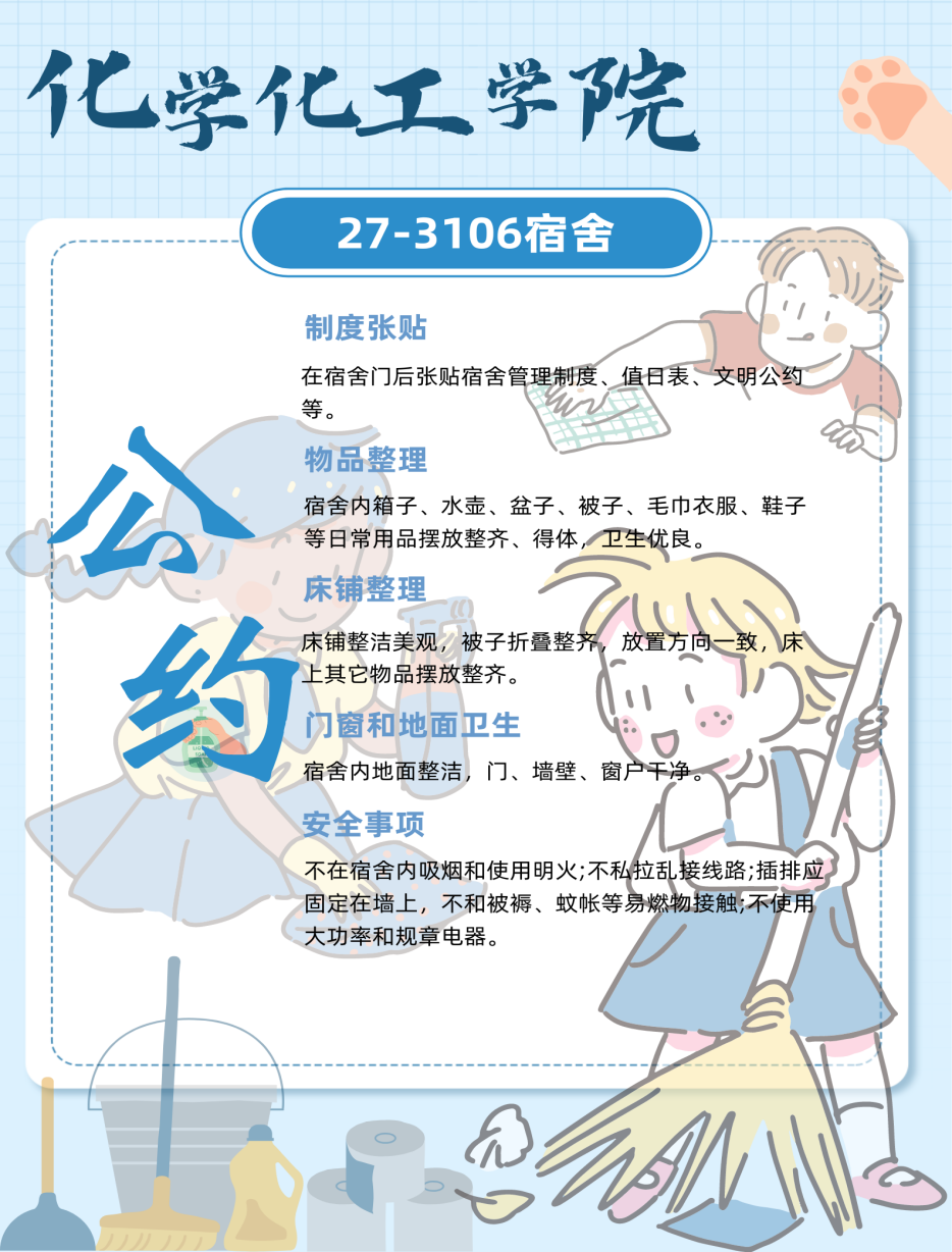 开展宿舍文明公约评比活动,各宿舍展示了精心制定的文明公约内容,包含宿舍温馨提示、值日表、作息表、规章制度、节约用水用电、良好学习氛围、环保习惯、相互包容理解等。评委组依据全面性、创新性和可操作文明公约评定标准,最终30间宿舍凭借其出色的公约内容脱颖而出。