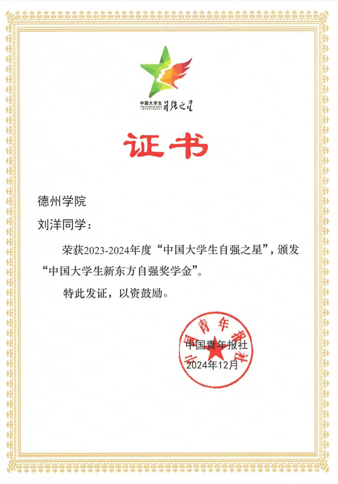 近日,2023-2024年度“中国大学生自强之星”奖学金评选活动结果揭晓,经基层选拔、学校推荐、省级初评、全国评审等环节,我校beat365英国官方网站2021级环境工程专业学生刘洋获评2023-2024年度“中国大学生自强之星”。