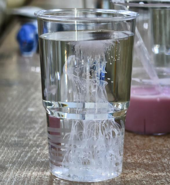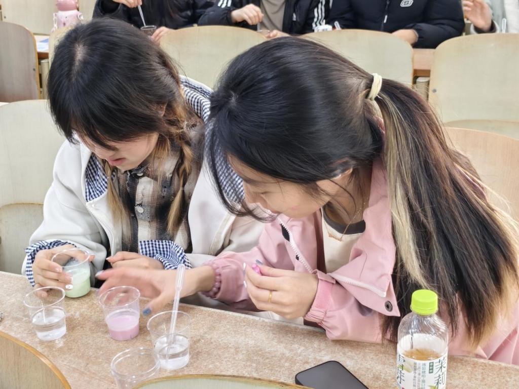 活动中,主持人向同学们讲解牛奶烟花化学原理和制作方法,随后按照步骤进行操作:向瓶中加入适量水,倒入少量食盐并搅拌至溶解,将盐水倒入清水中静止5分钟;与此同时,同学们往另一个杯子中倒入适量牛奶,倒入不同的食用色素搅拌均匀,最后用滴管逐滴加入杯中,就能看到液滴在盐水中缓缓下沉,像烟花绽放一样,形成绚丽多彩的“牛奶烟花”。同学们积极讨论,热情高涨,分享自己的实验成果,活动氛围热烈。