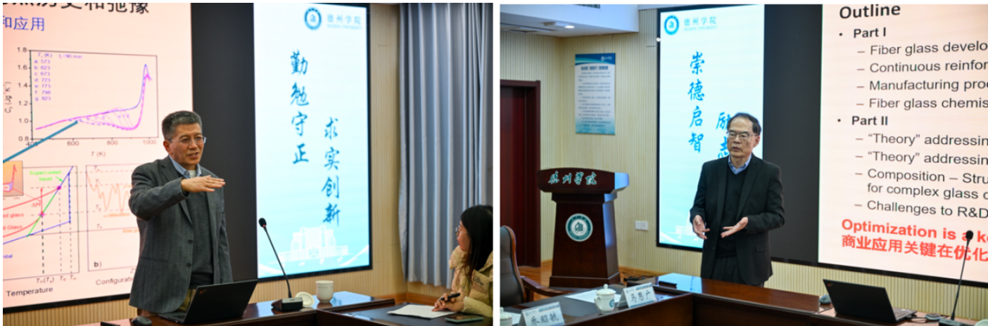 座谈会结束后,岳远征以《我的玻璃之缘》为题作学术报告,结合自身数十年科研经历,分享了与玻璃材料领域结缘的历程、关键研究节点的突破故事,以及玻璃材料在前沿科技领域的创新应用方向;李洪围绕《玻璃纤维制造技术及新产品开发中的挑战》展开汇报,系统分析了当前玻璃纤维制造行业的技术现状、核心工艺难点,重点剖析了新产品开发中面临的材料性能优化、绿色生产转型、市场适配性等关键挑战,并提出了针对性的解决思路与技术路径。两位专家的报告内容翔实、深入浅出,为在场师生带来了一场兼具理论高度与实践指导意义的学术盛宴。报告后,在场师生与专家进行了深入交流,现场互动氛围热烈。