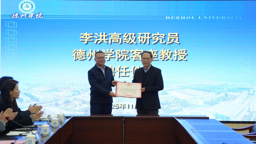 吴君为李洪颁发“德州学院客座教授”聘书。