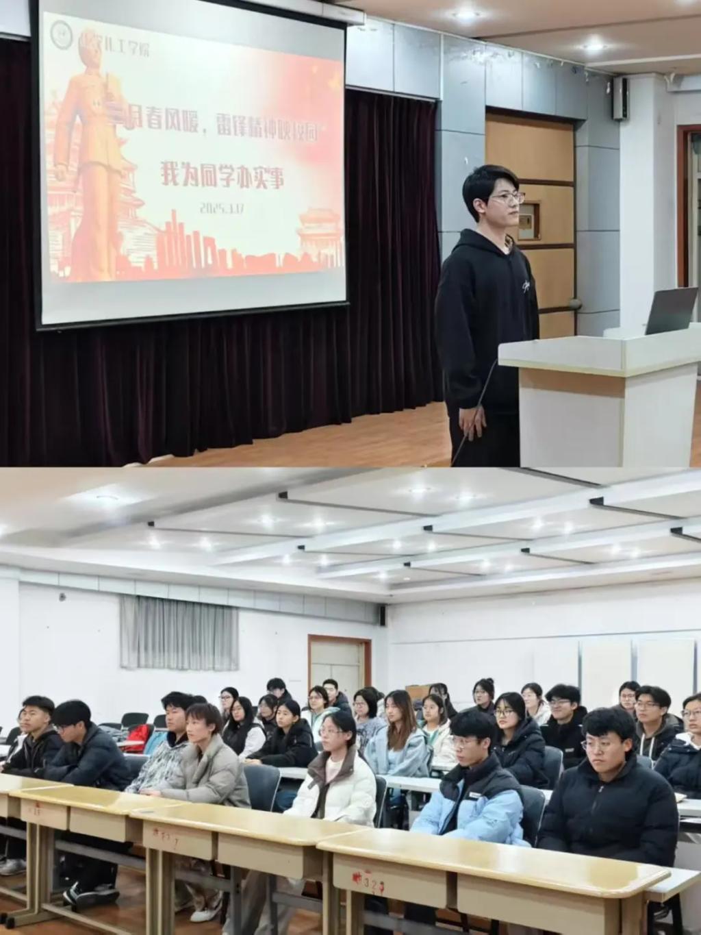 创新采用“理论研习+专业认知”双轨模式,持续深化雷锋精神传承。举办“学雷锋精神,铸化学匠心”主题团日活动,借助化学领域实际案例,生动阐释“螺丝钉精神”的时代内涵,激励学生将工匠精神转化为科研动力。“实验室里的雷锋精神”分享会邀请优秀学生分享“科研互助案例”,深入剖析“仪器共享”“数据共建”背后的奉献精神,为科研发展凝聚专业力量。此外,依托“我为群众办实事”活动举办的“青春担当”宣讲会,志愿者们讲述“安全守护员”“考研护航员”等实践经历,诠释了雷锋式科研品格。