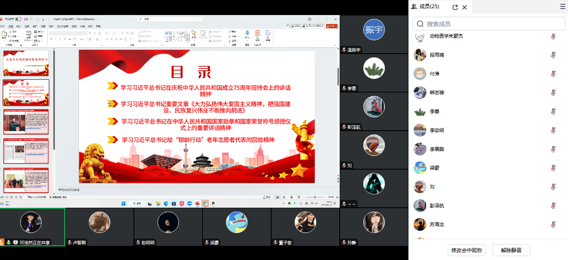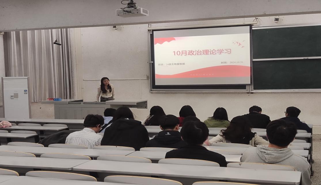 为深入学习贯彻习近平总书记近期重要讲话指示精神,进一步推动教育强国建设,弘扬教育精神,培养高素质人才,深入贯彻落实全国教育大会精神,激发研究生的学习热情和创新意识,动物科学技术院研究生于2024年10月18日-10月30日在各班举行了10月政治理论学习活动,本次会议以班级班会组织学习、讨论为主,利用学生业余时间自学等形式为辅,线上、线下学习相结合,使理论学习取得良好的效果,加深对教育事业发展的认识,同时为研究生提供一个交流学习的平台。会议由各专业班级负责人主持,回顾了全国教育大会的主要内容和精神,强调了教育在国家发展中的重要性。会议中,还邀请了几位优秀的同学代表分享他们对教育改革的看法和个人的学习心得。在互动环节,同学们积极发言,讨论了当前教育领域面临的挑战与机遇。大家一致认为,作为新时代的研究生,应当肩负起推动教育改革和发展的责任,努力提升自身的学术素养和实践能力。
