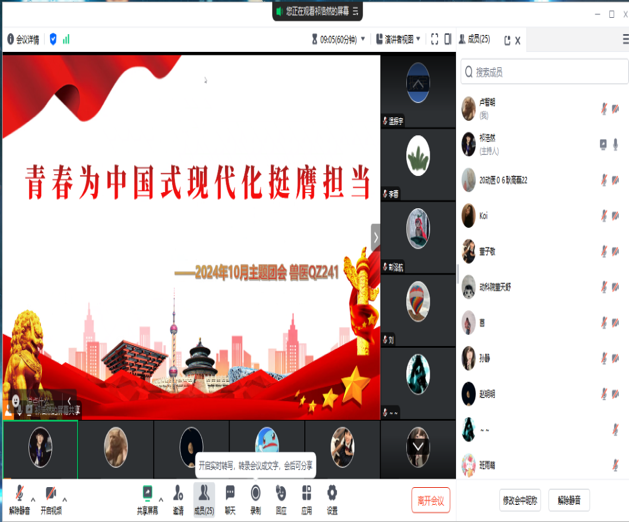 本次政治理论学习圆满结束。同学们积极参与学习,分享了各自的学习心得,促进了政治理论思想与实践上的结合,本次学习引导同学们深刻理解个人命运与国家发展的紧密联系,强调青年学生的使命与责任,不忘初心,为实现中华民族伟大复兴的中国梦而不懈努力,回顾历史、展望未来,如何更好支撑和服务中国式现代化,增强了开放包容、互联互通、共同发展的意识,进一步树立清风正气,严守政治纪律,共同推动构建人类命运共同体。