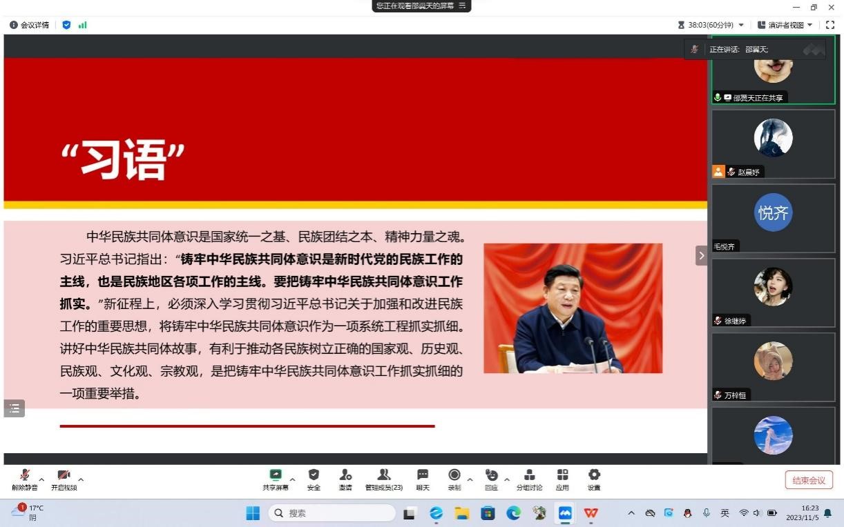邵翼天同学以“铸牢中华民族共同体意识”为主题,分享了自己的学“习”工程的心得体会。他从自成一体的地理空间、“大一统”第五政治文化传统、相互依赖的经济生活、互相吸纳的人口联系和互鉴融通的中华文化等五个方面展开,强调铸牢中华民族共同体意识的重要性与必要性。