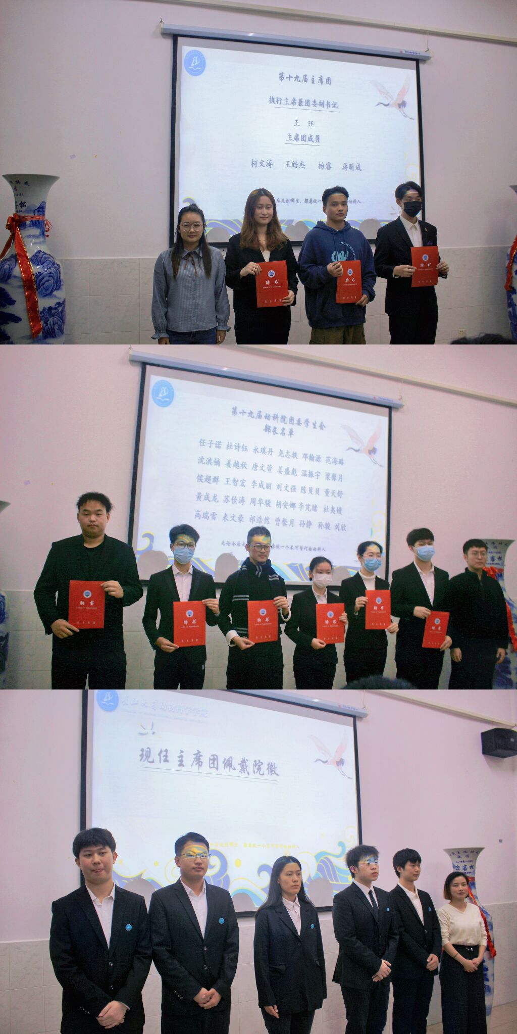 第二项是颁奖环节,学院杨湘虹老师颁发了第十九届主席团成员和部长级聘书以及为现任主席团成员佩戴徽章,并拍照留念。