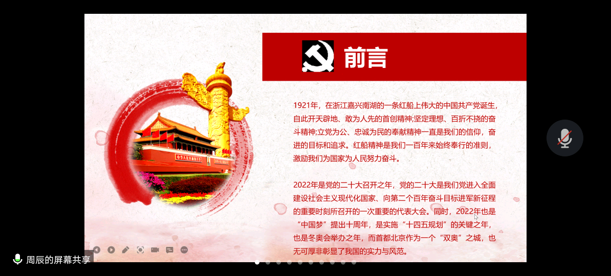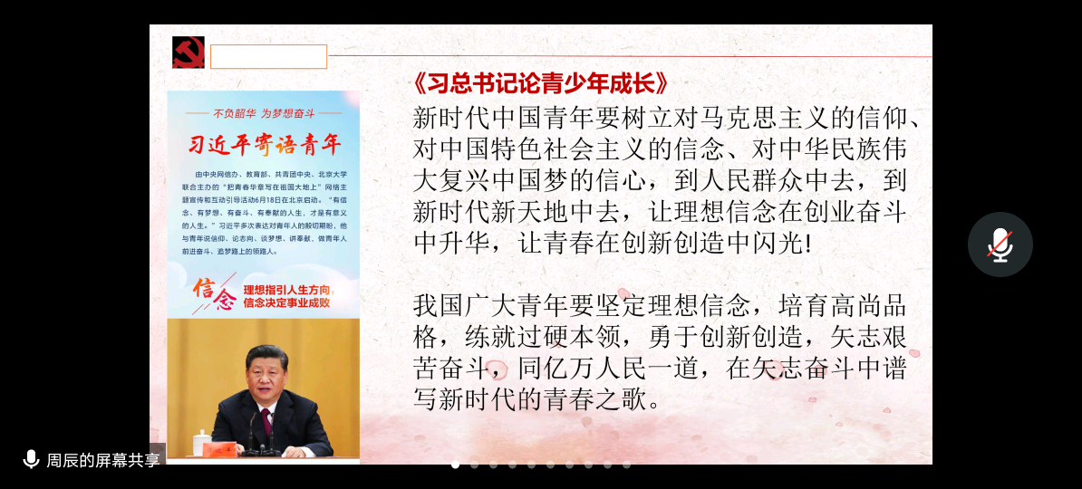 周辰向同学们介绍了习近平总书记对青年人的殷切期盼,他与青年人说信仰,论志向,谈梦想,讲奉献,为青年人的前进奋斗指明道路。习近平总书记说:“广大青年要保持初生牛犊不怕虎的劲头,不懂就学,不会就练,国家的希望在青年,民族的未来在青年,广大青年学子当在奋斗中创造精彩人生,为祖国与人民贡献青春力量”。每一句殷切嘱托都让同学们对自己的未来充满期待。