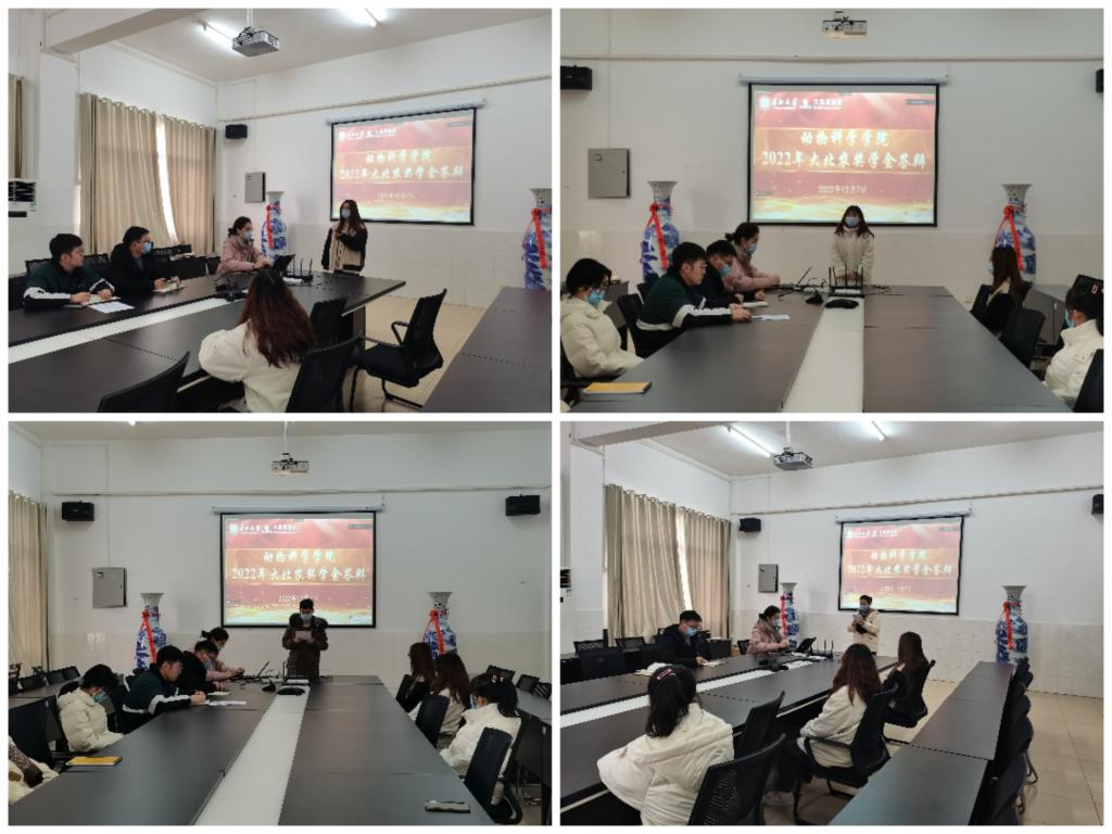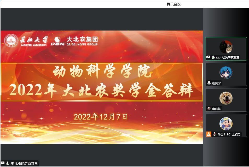 为落实立德树人根本任务,发挥奖助育人的功能,激励广大学生发奋学习、全面发展、立志成才,2022年12月7日中午12时,新葡萄官网amg动物科学学院2022大北农奖学金答辩会在西校区5教1005以及腾讯会议(会议号569-196-673)线上线下同时展开,新葡萄官网团委书记王海洋、辅导员杨湘虹、宋宇航、、严子星及参与答辩的学生参加,会议由王海洋主持。