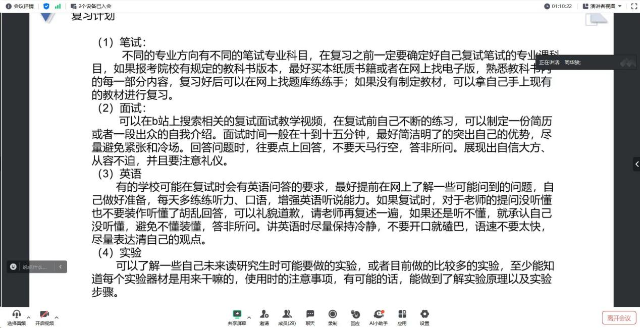 交流会上,董天舒、闫丫丫等研究生通过精心准备的PPT,系统讲解了复试流程、面试技巧、材料准备及心态调整四大核心模块。董天舒结合自身经历,强调“提前模拟面试”的必要性,建议考生通过录制视频复盘表达逻辑与仪态。闫丫丫针对“专业问答”环节提出“三步法”:梳理核心知识点、关联科研热点、总结个人见解,帮助考生构建系统性应答框架。高依恒与来文豪则聚焦PPT汇报要点,强调“内容精炼、逻辑清晰、突出科研潜力”,并分享了用图表展示实验成果的技巧。周华骏通过案例分析,鼓励考生“扬长避短”,将本科经历与报考方向深度融合,展现综合素养。辅导员杨湘虹从心理调适角度补充道:“复试是能力与心态的双重考验,考生需避免过度焦虑,可通过正念练习、模拟场景脱敏等方式增强自信。”