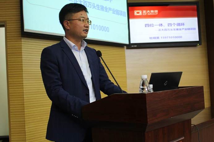 会议伊始,杜奎带领大家重温畜牧行业历史,由过去毛主席所说的“猪粮安天下”,到现如今习近平主席提出的“农业强、农村美、农民富”的理念引出了农畜牧行业的美好发展前景以及光明的就业前途。其中还列举了谢国民等相关行业中的佼佼者,以此来激发在座学子对专业的热情和认同。同时,他还通过多项数据分析了当下的市场需求以及发展空间,进一步消除了部分学子因缺乏了解而对所学专业产生的偏见。紧接着,杜奎介绍了正大集团的全产业链发展的核心理念:三高一低、四位一体、三产联动、三利原则。全产业链的运营模式取得了显著成效,让同学们对正大集团有了更加深入的了解同时也让他们对未来有了新的规划。