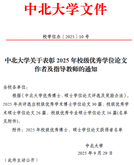 近日,中北大学发布了《中北大学关于表彰2025年校级优秀学位论文作者及指导教师的通知》,共评选出2025年校级优秀专业硕士学位论文36篇,其中2名beat365英国官方网站联合培养研究生获优秀专业学位硕士论文。