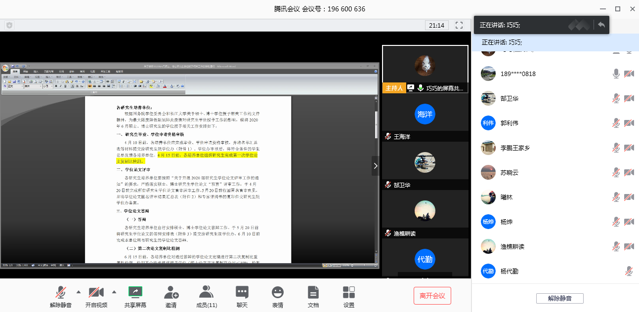(通讯员:王海洋)为精准做好2020届硕士研究生毕业工作,了解硕士研究生就业动向,力求做到全体硕士毕业生能够顺利毕业,4月7日19:30,新葡萄官网amg利用腾讯会议APP召开了2020届硕士研究生导师工作会议,就毕业生的毕业论文和就业等相关工作进行了部署。会议由副院长许巧情主持,副书记苏晓云、副院长杨烨、全体毕业生导师、研究生秘书和分管就业工作的老师参加了会议。