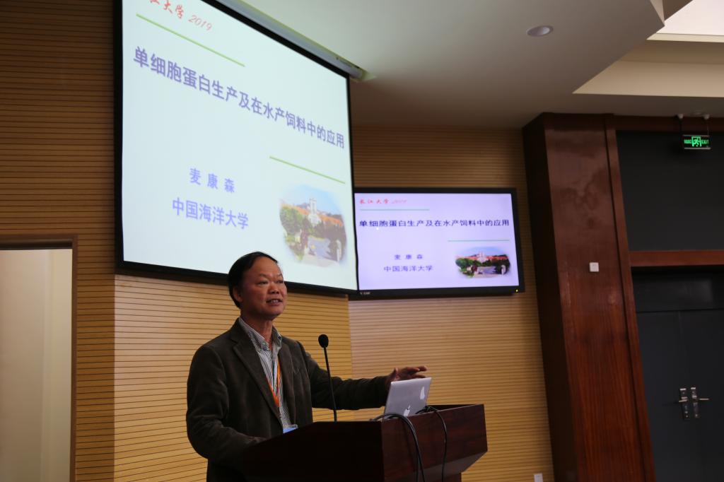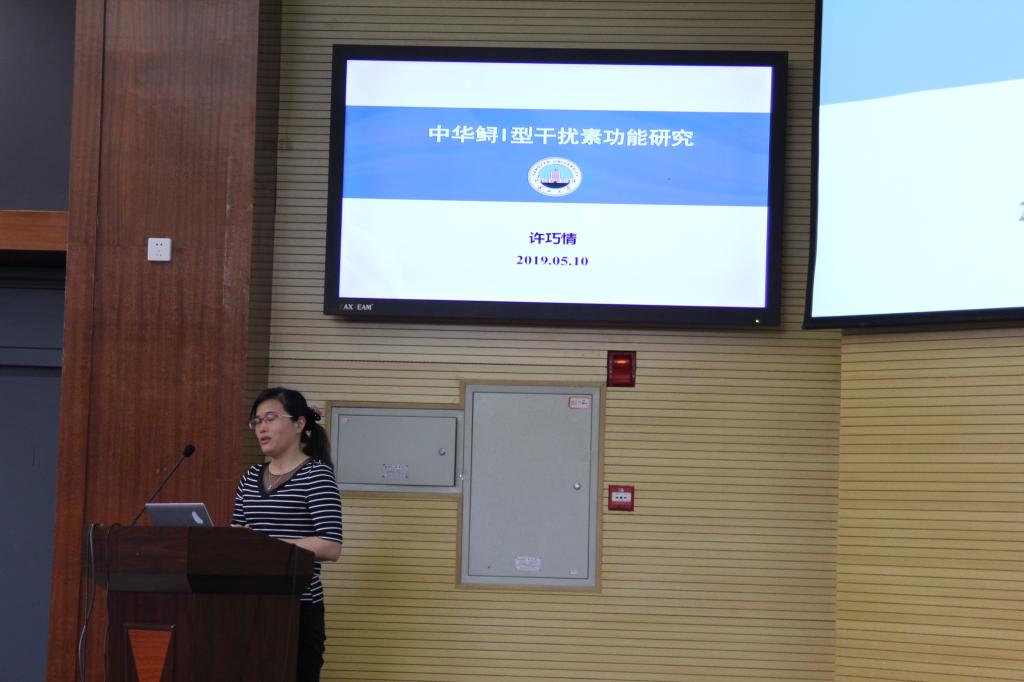 会议共有12位专家做了精彩的学术报告,深入探讨了水生动物营养与免疫的前沿进展,阐明了水生动物营养需求、水生动物免疫应答机制及其与病原的互作关系,推动了营养学和免疫学在水产健康养殖实践上的应用。会上麦康森院士做了题为“单细胞蛋白生产及在水产饲料上的应用”的报告。聂品研究员等多位专家在本次会议上介绍了自己最新的研究成果。新葡萄官网amg动物科学学院许巧情教授做了“中华鲟I型干扰素功能研究”的报告,从中华鲟作为濒危保护动物幸存数量、疾病和免疫研究现状、进化地位等角度阐述了中华鲟保护的重要意义,并分享了近两年来课题组关于中华鲟干扰素的研究成果。