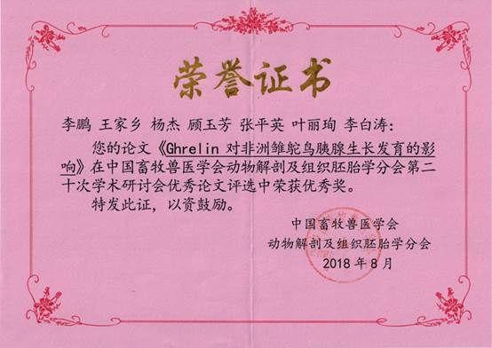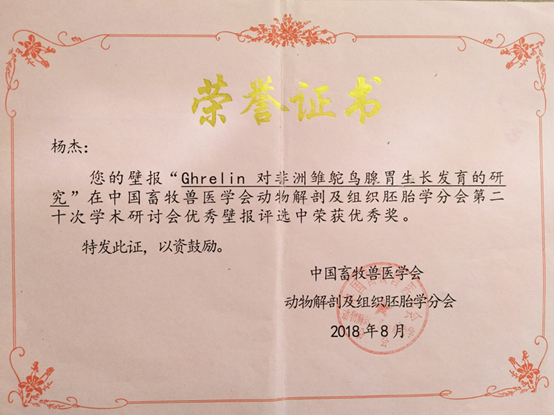 本次会议最后评审出35篇优秀论文和25张优秀壁报。新葡萄官网提交的论文《Ghrelin对非洲雏鸵鸟胰腺生长发育的影响研究》(作者:李鹏、王家乡、杨杰、顾玉芳、张平英、叶丽珣、李白涛)获评优秀论文,《Ghrelin对非洲雏鸵鸟腺胃生长发育的影响研究》(杨杰)获评优秀壁报。这是新葡萄官网amg鸵鸟研究所在全国专业性学术研讨会上的一次重大突破。