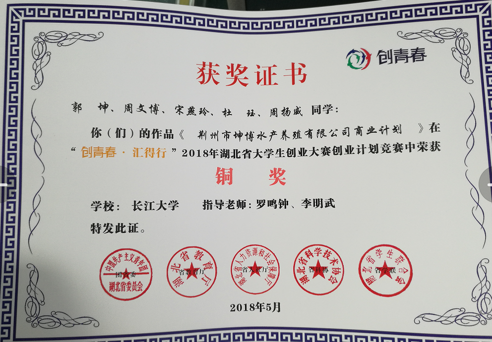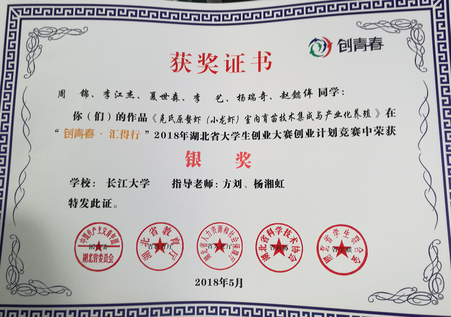 通过决赛比拼,新葡萄官网《克氏原螯虾(小龙虾)室内育苗技术集成与产业化养殖》项目获得银奖,《荆州市坤博水产养殖有限公司商业计划》项目获得铜奖。
