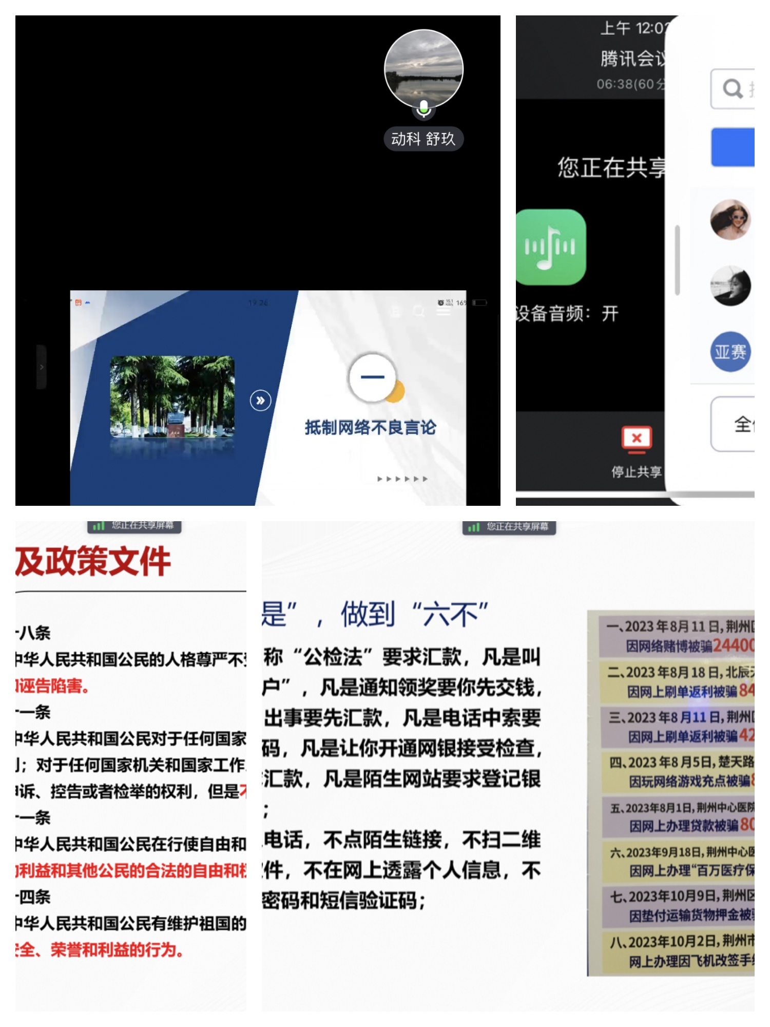 五一假期将至,为确保研究生度过一个安全、愉快的假期,按照研工部、学院部署,研究生以班级为单位通过线上线下相结合的方式开展了安全教育主题班会。 此次班会内容丰富,涉及交通安全、食品安全、网络安全等多个方面,通过案例分析和专家讲解视频,让同学们深刻认识到安全的重要性。研究生辅导员王婷特别强调了假期期间的安全注意事项,提醒同学们遵守法律法规,注意个人财物安全。 此次线上安全教育主题班会的开展,有效提升了同学们的安全意识和自我保护能力,为营造平安和谐的校园环境奠定了坚实基础。 (审核 苏应兵|编辑 罗婧雪 王婷)