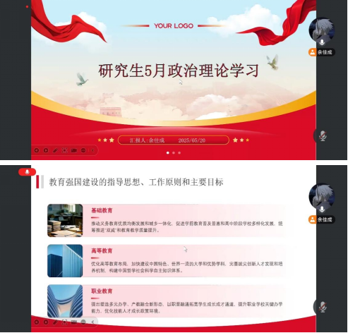 为深入学习贯彻习近平新时代中国特色社会主义思想,进一步增强“四个意识”,坚定“四个自信”,做到“两个维护”,提升我校研究生政治理论素养,深刻认识和准确把握党的二十大重大主题、重大理论观点、重大战略思想。新葡萄官网amg全体研究生于2025年5月8日—5月30日在各班举行了5月政治理论学习活动,本次会议以班级班会组织学习、讨论为主,利用学生业余时间自学等形式为辅,线上、线下学习相结合,使理论学习取得良好的效果。 本次政治理论学习主要内容如下: 1.习近平在中共中央政治局第二十次集体学习时强调 坚持自立自强 突出应用导向 推动人工智能健康有序发展 2.庆祝中华全国总工会成立100周年暨全国劳动模范和先进工作者表彰大会隆重举行 习近平发表重要讲话 3.习近平在上海考察时强调加快建成具有全球影响力的科技创新高地 4.《求是》杂志发表习近平总书记重要文章《激励新时代青年在中国式现代化建设中挺膺担当》 5.中共中央 国务院印发《教育强国建设规划纲要(2024—2035年)》 本次政治理论学习圆满结束。同学们积极参与学习,分享了各自的学习心得,促进了政治理论思想与实践上的结合。通过本次学习,同学们深刻认识到了科技创新和现代化建设的重要性,将以习近平总书记重要讲话精神为指引,团结一心、真抓实干,奋力书写属于青年人的新篇章,为中国伟大发展和地方社会发展作出新的更大贡献。 (审核:孙恺|编辑:刘恩海 史博敏 杨湘虹)
